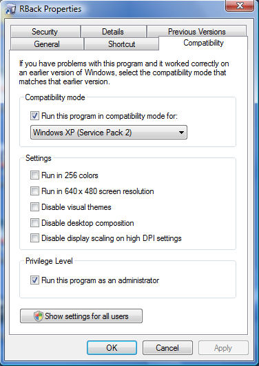 Q: How can I run RBack on windows Vista A: Version 3 of RBack will be designed for windows Vista but until then this is how you can setup version 2.8 to work on windows vista